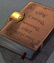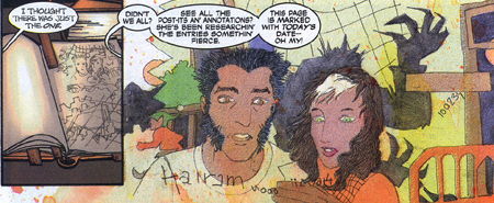 After reading a letter from Kitty Pryde (who has disappeared), Rogue convinces Logan to help her look through Kitty's room. Their search uncovers "Irene Adler's Diary of Destiny - Volume Seven." They open the diary to find drawings depicting that very moment...of them discovering the diary. |
