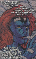Mystique: "...Brava wind-rider, you're paying attention. When Irene turned thirteen her power of precognition catalyzed. She started auto-writing, transcribing as best she could the visions cascading through her head..." |