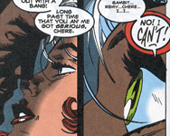 Issue - X-Men #24 Situation - On their first successful date, Gambit takes Rogue out to dinner, and then on a romantic carriage ride through Central Park. He asks Rogue to trust him and tries to kiss her...but she pulls away, admitting that she's afraid of unintentionally putting him in a coma. Result - He tells her that they'll just have to find another way to express their feelings for each other. |