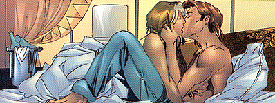 Issue - X-Treme X-Men #7 Situation - In a battle with Lady Mastermind and Sebastian Shaw, Rogue has fallen under Lady Mastermind's spell...which begins with her in bed with Gambit. Although she isn't entirely convinced, I guess the part of her that wishes she could safely touch people gets the better of her. Result - Rogue is very happy for a very short period of time. Why no absorption? - It's all an illusion...she's not actually kissing anybody, so there's nothing to absorb. |